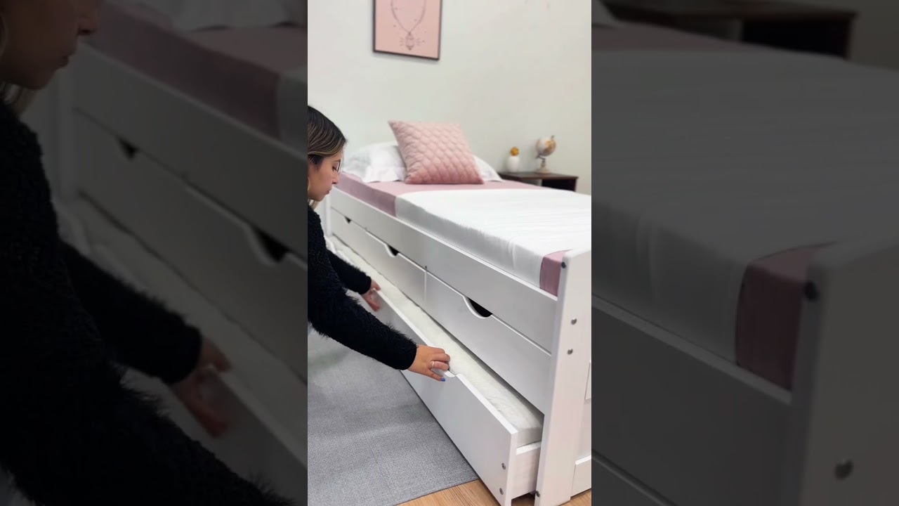 Das Massivholzbett JESSY kombiniert Schlaf-, Gästebett- und Stauraumfunktion in einem kompakten Möbelstück. Es verfügt über eine Liegefläche für den täglichen Gebrauch sowie ein integriertes Auszugsbett, das bei Bedarf zusätzlichen Schlafplatz bietet. Drei Schubladen unter dem Bett schaffen praktischen Stauraum für Bettwäsche, Kissen oder Spielzeug. Mit seinem klaren, zeitlosen Design lässt sich das Bett vielseitig in Kinderzimmer oder Jugendzimmer integrieren.