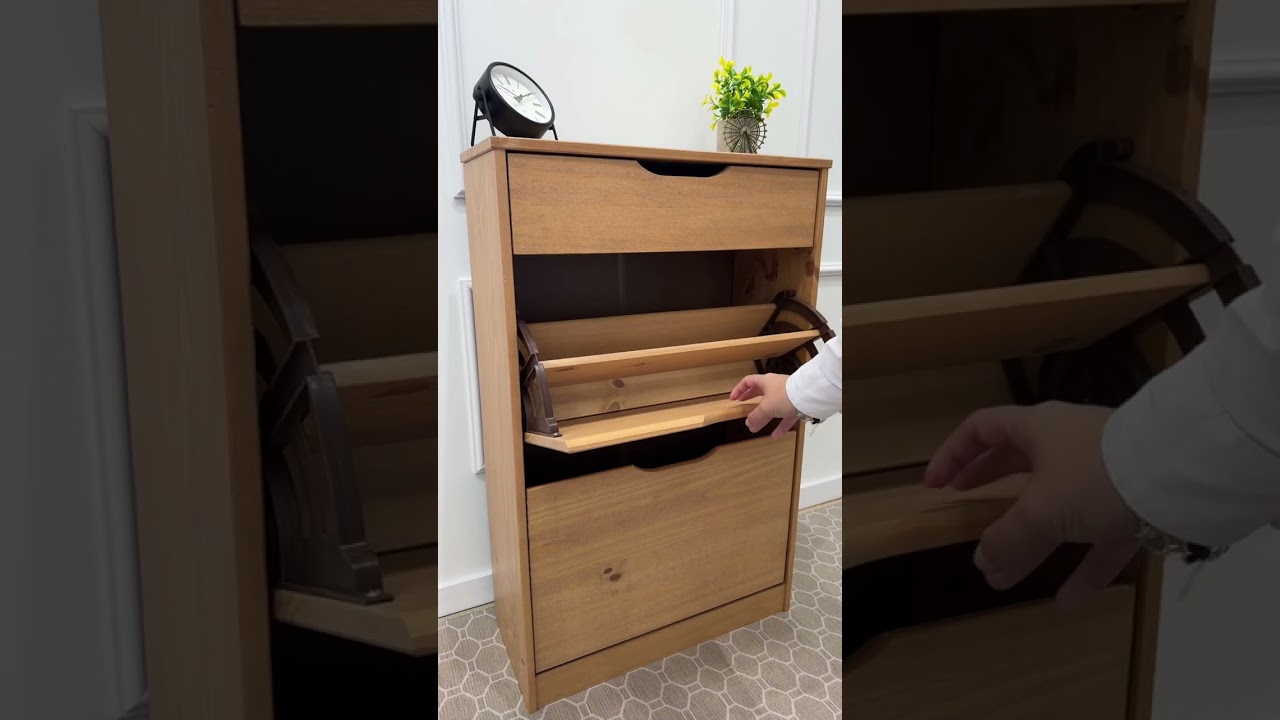- Le meuble à chaussures est fabriqué en pin massif lasuré brun.